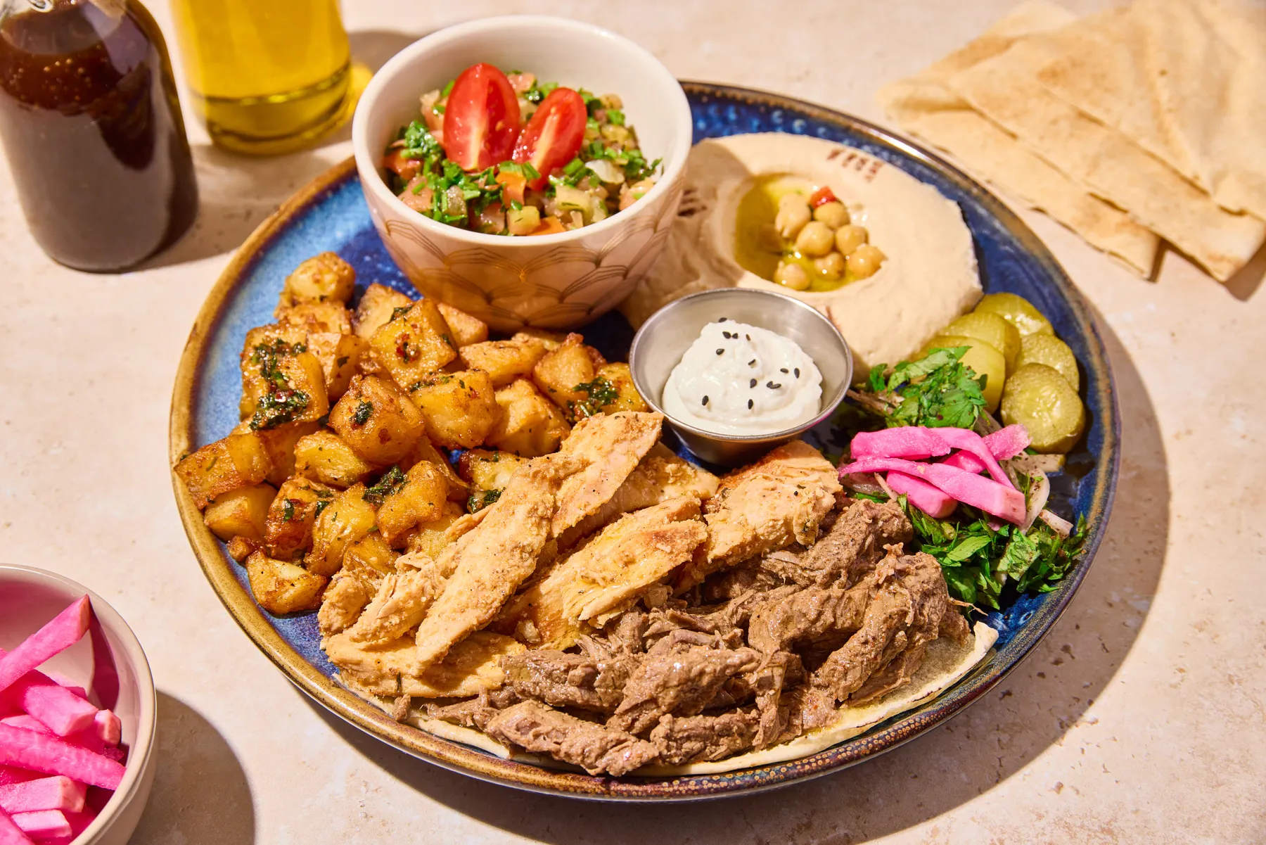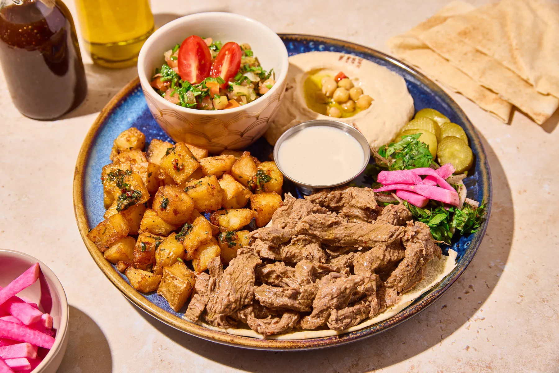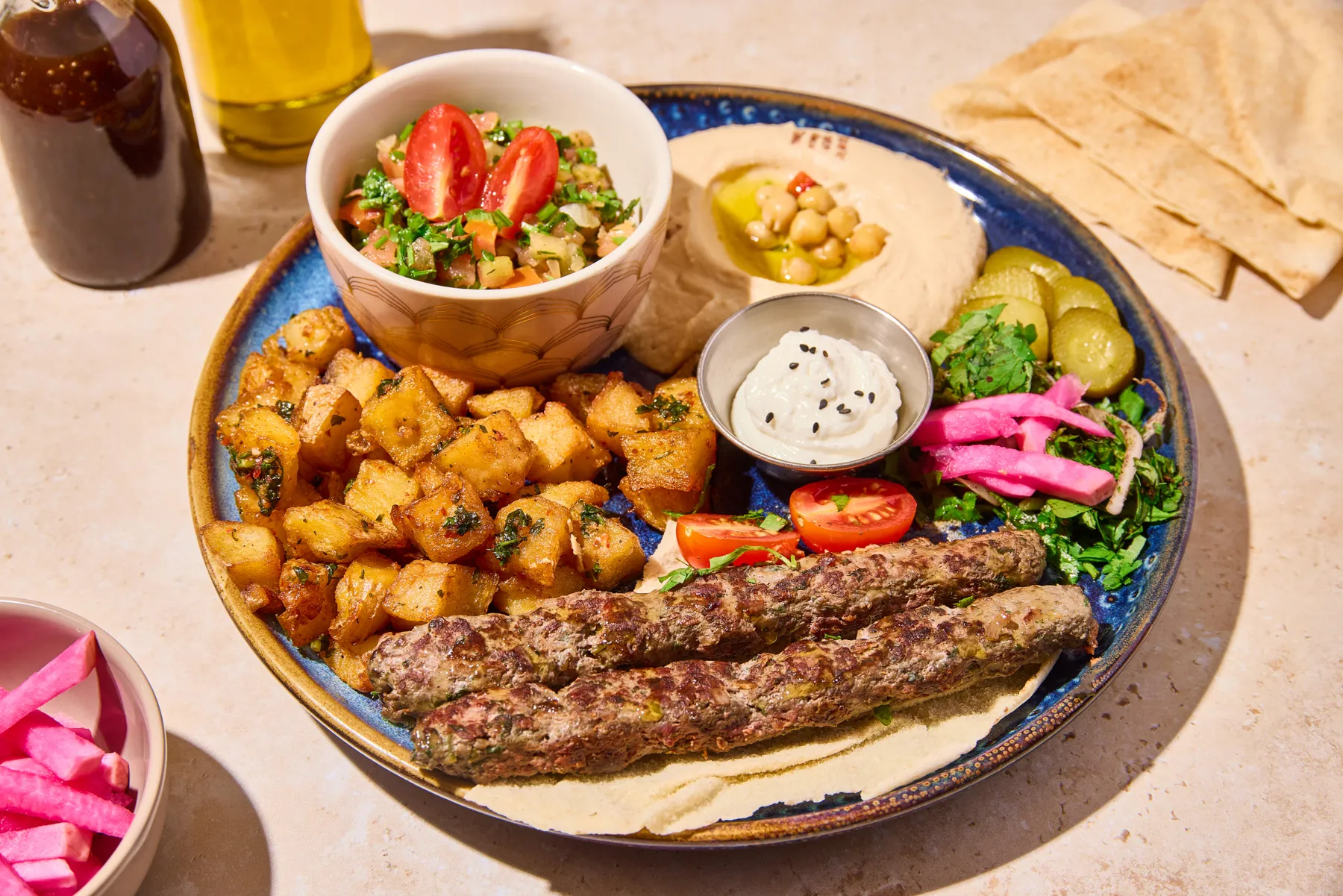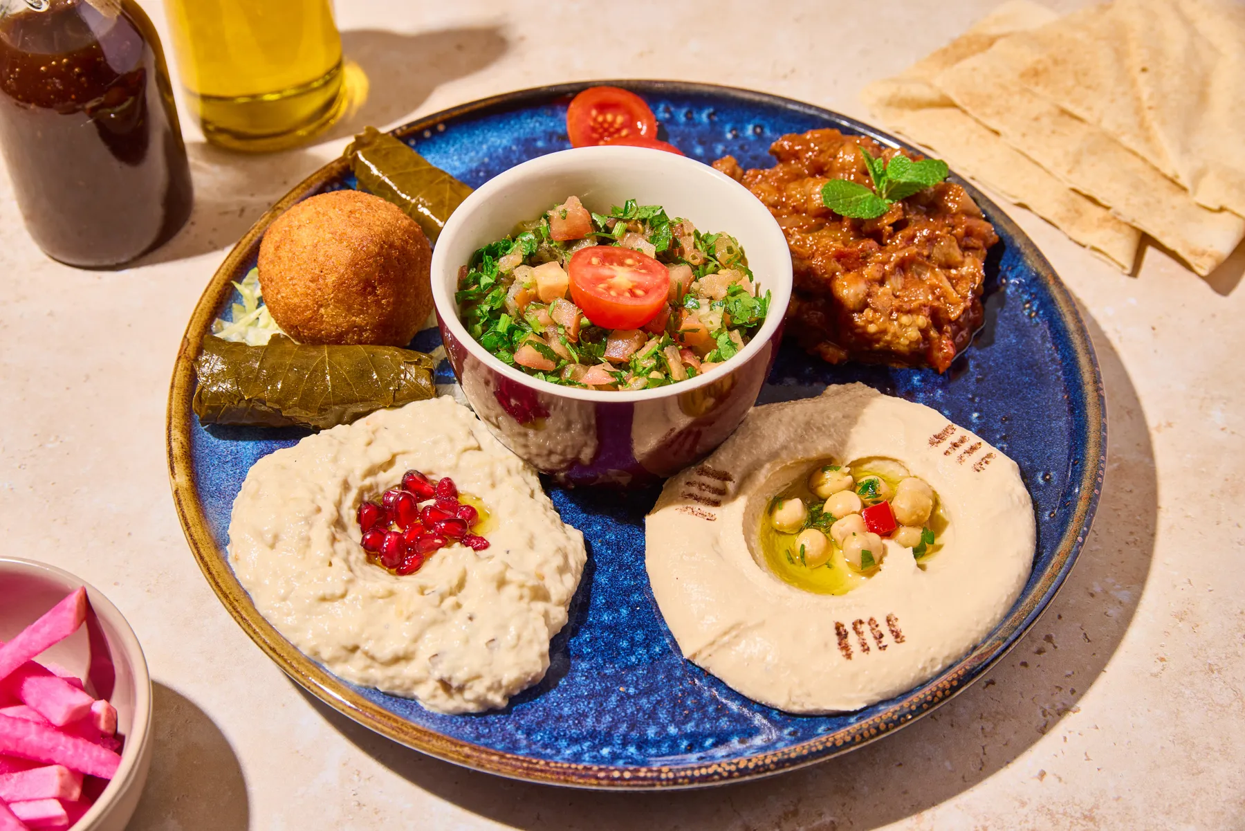 À partir de 2 personnes. Les incontournables de la cuisine libanaise. Que vous soyez végé ou amateur de viande, dégustez notre assortiment de variétés qui fera voyager vos papilles au pays du Cèdre ! (mezzés froids, beignets, viande, le tout accompagné de nos légendaires pommes de terre de riz ou de blé). AU CHOIX : 4 mezzés froids, 4 bouchées salées et 2 mezzés chauds
