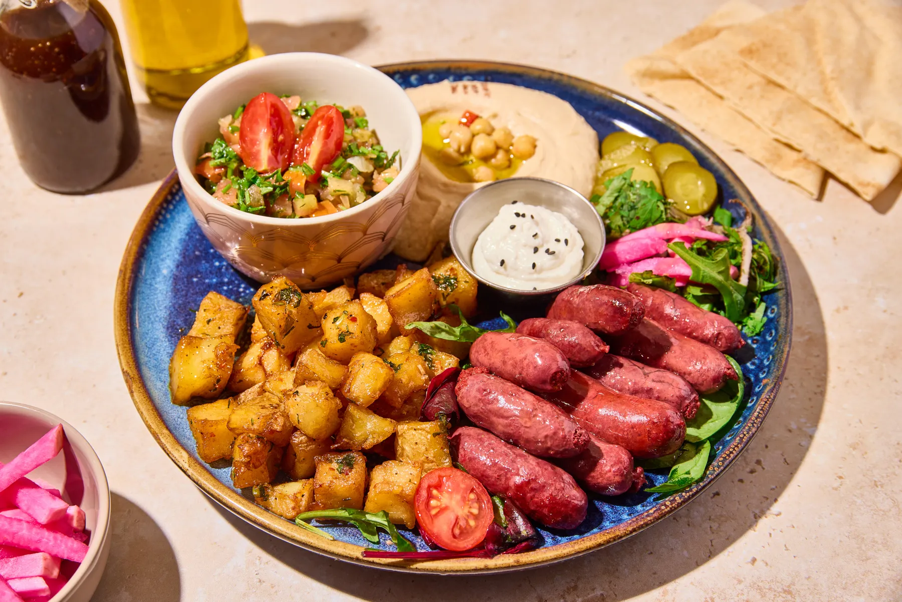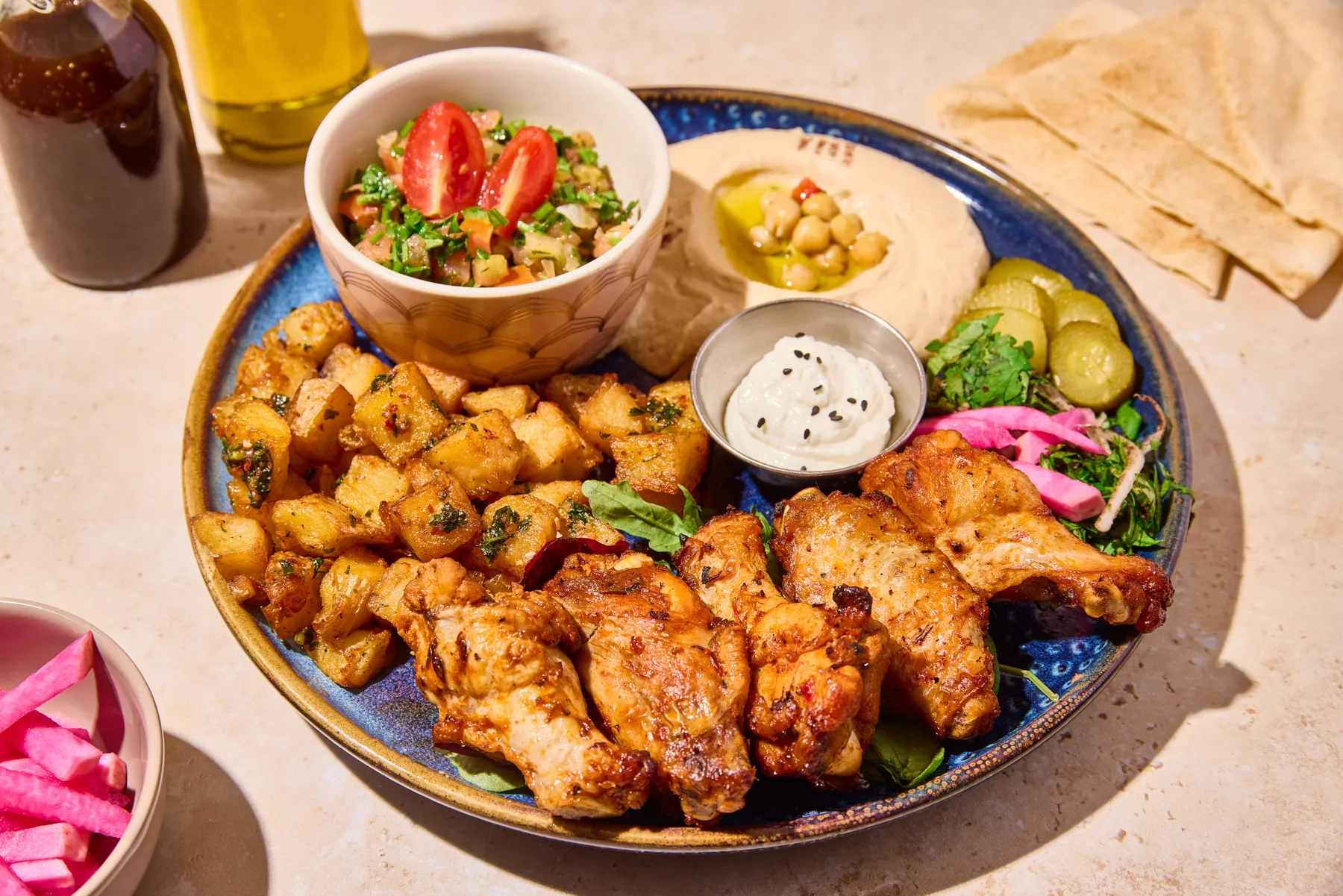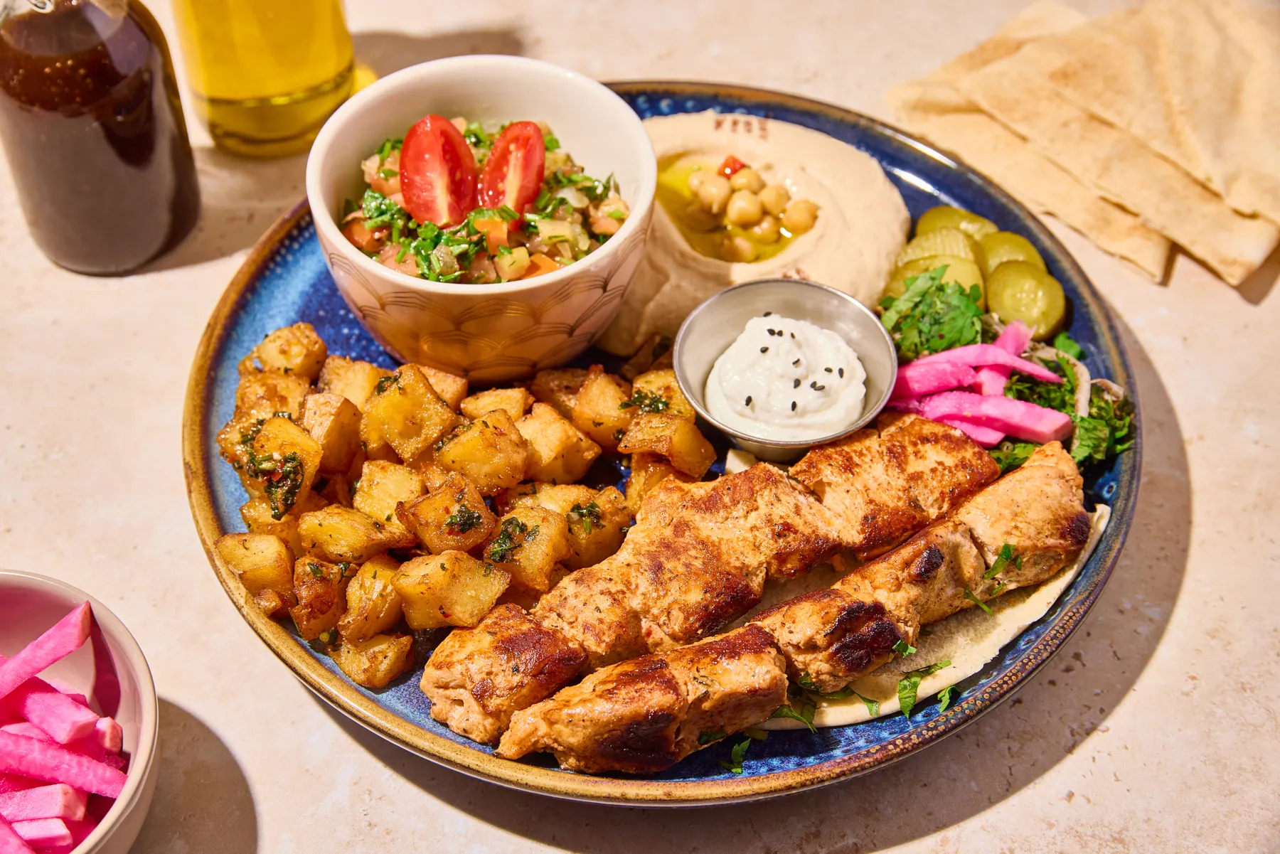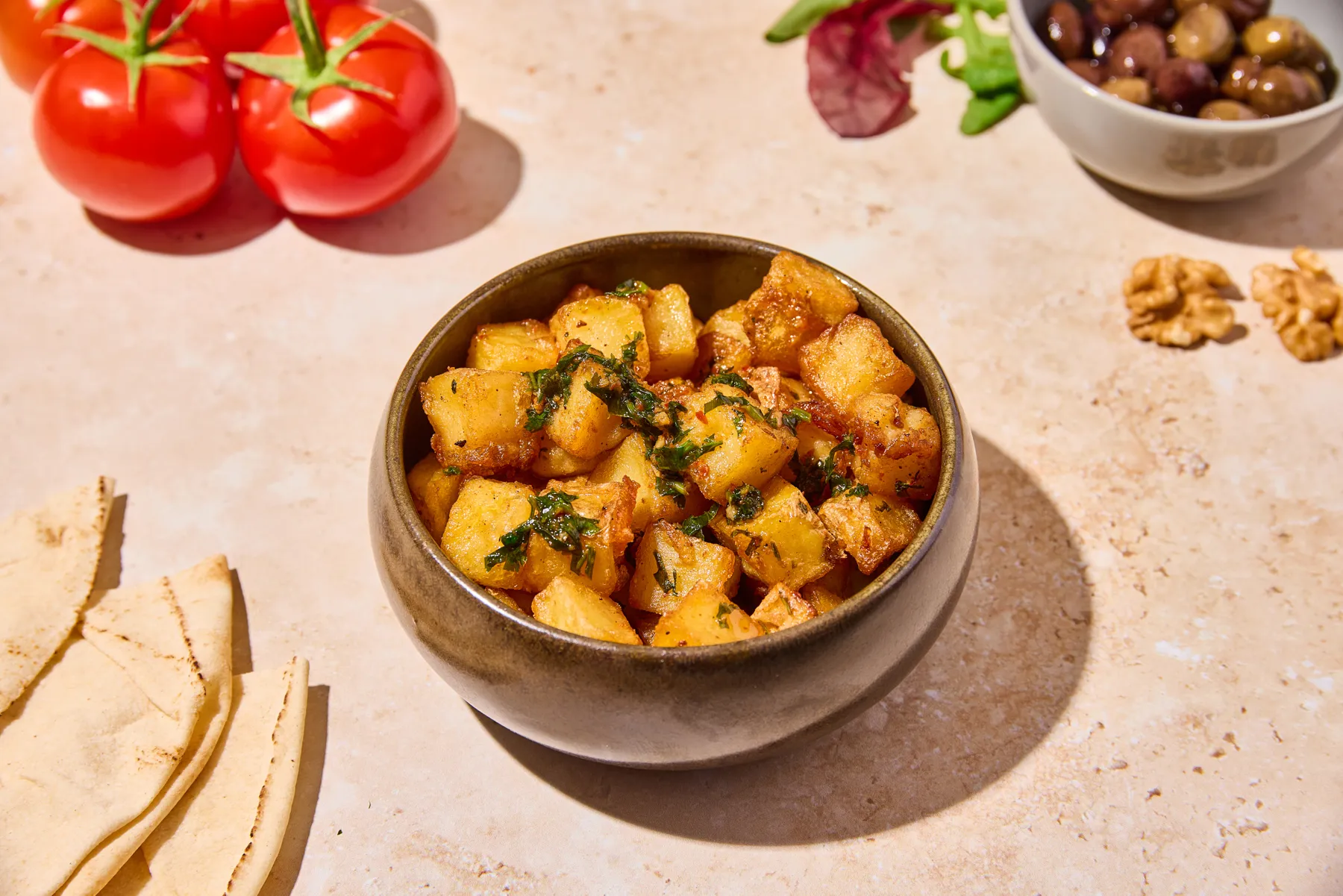 À partir de 2 personnes. Les incontournables de la cuisine libanaise. Que vous soyez végé ou amateur de viande, dégustez notre assortiment de variétés qui fera voyager vos papilles au pays du Cèdre ! (mezzés froids, beignets, viande, le tout accompagné de nos légendaires pommes de terre de riz ou de blé). AU CHOIX : 4 mezzés froids, 4 bouchées salées et 2 mezzés chauds